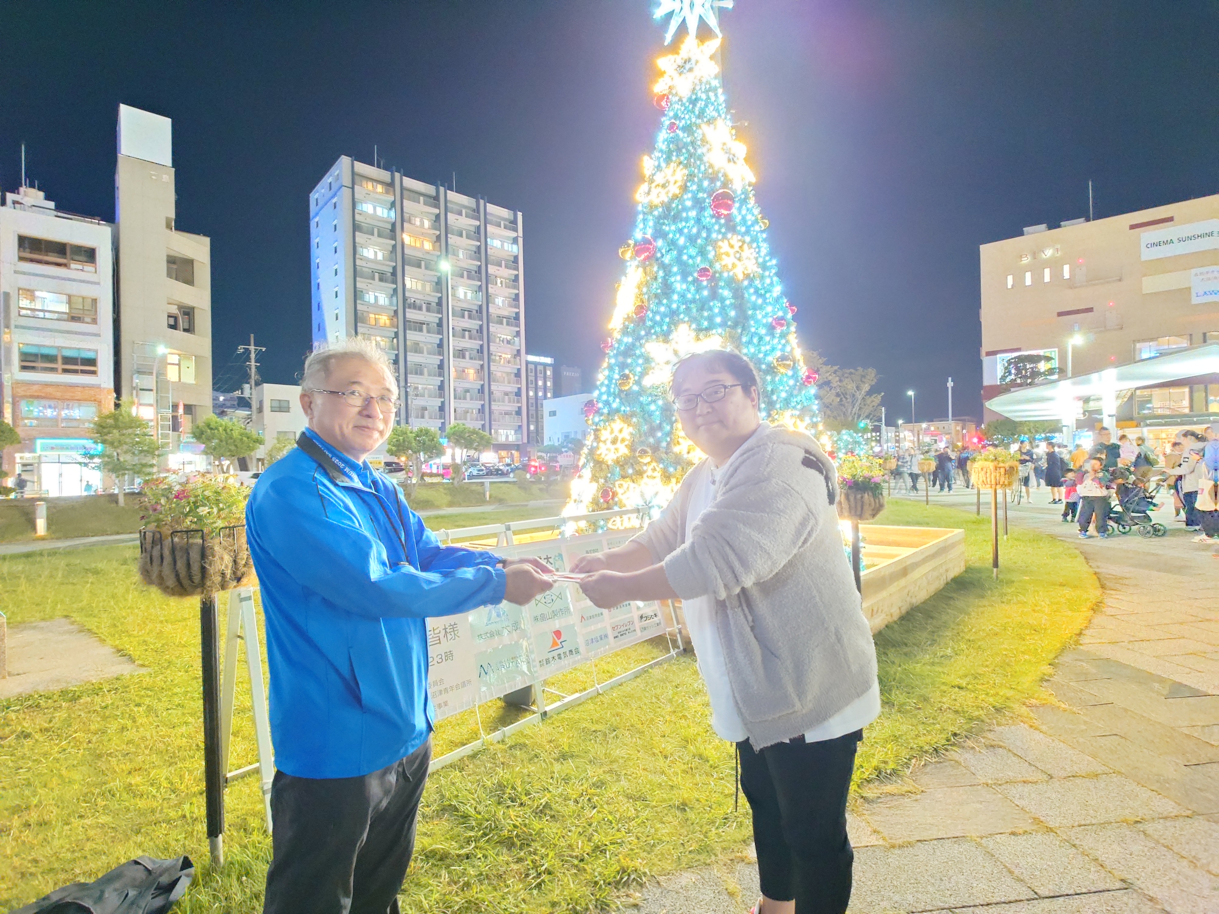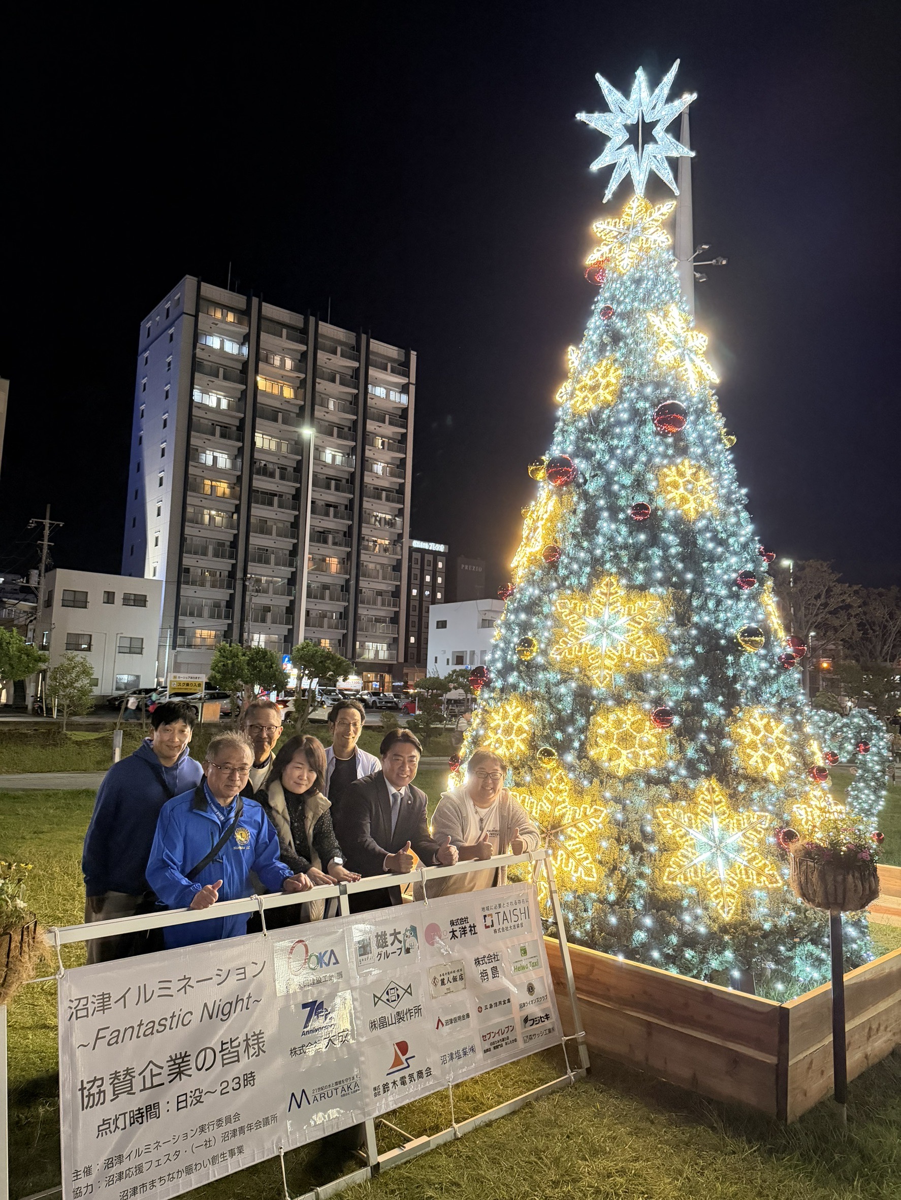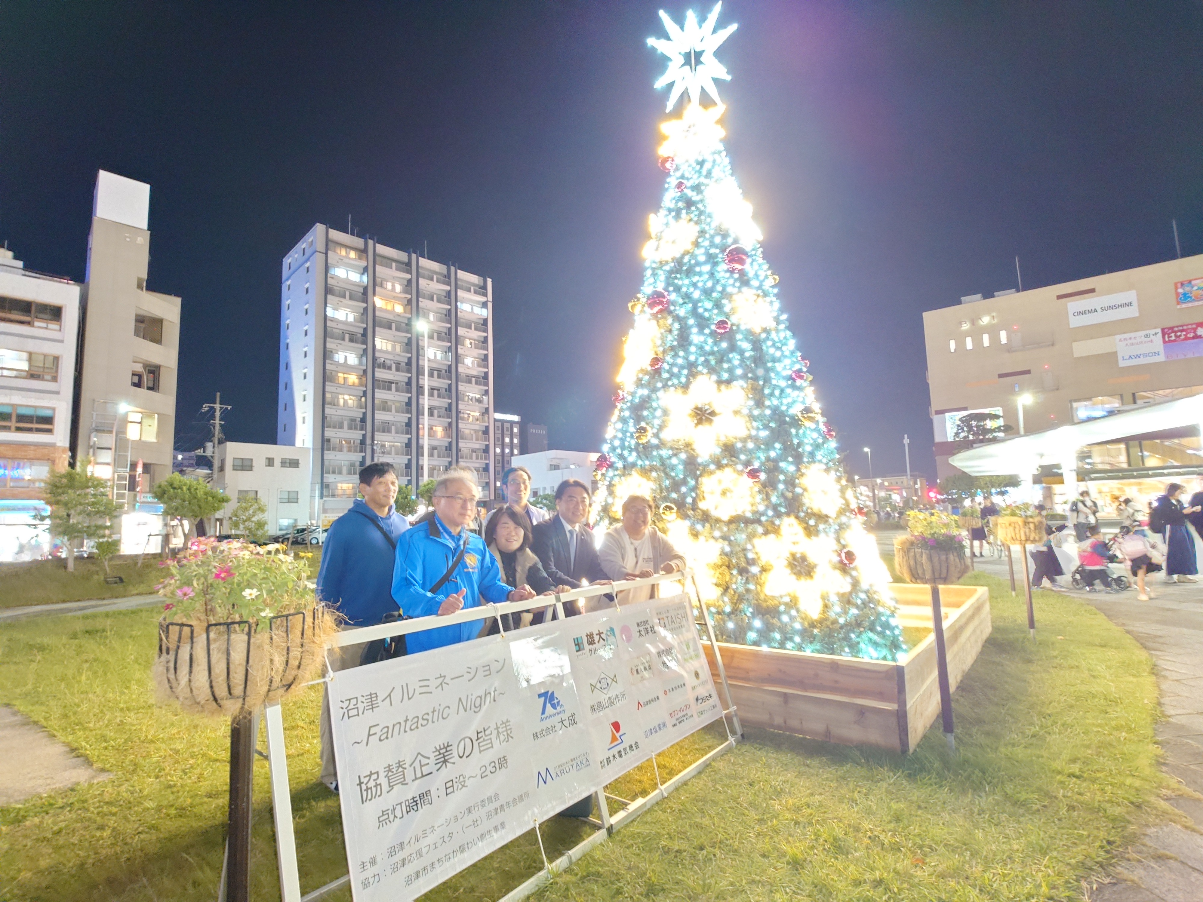 沼津ライオンズクラブのメンバーである L 山本真太郎・L 加藤あきこ 両名が中心となり立ち上げた「沼津イルミネーション実行委員会」では毎年冬に沼津市内へ、イルミネーションを設置する活動を続けています。今回は6年目の取り組みとなり、沼津駅北口広場に高さ6mを超える巨大なクリスマスツリーが設置されました。沼津ライオンズクラブも協賛させていただいており、そのお披露目となる点灯式に、参加しました。