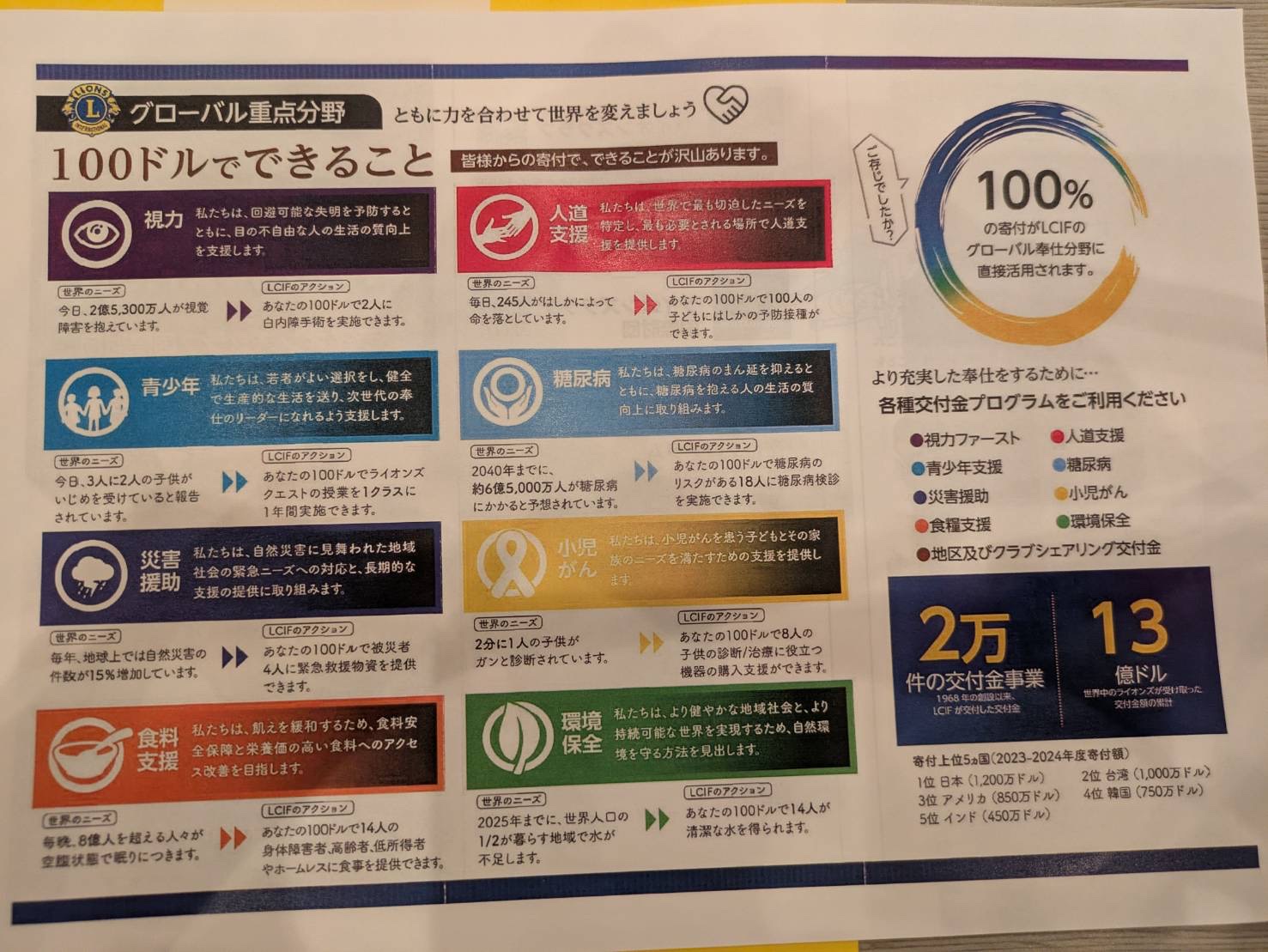 LCIFは、世界中の人道支援や災害援助、視力保護、糖尿病・小児がん対策、青少年支援、環境保全などを行う団体で、寄付を通じた支援を行っています。日本からの寄付総額は100億円を超え、2023〜24年は1,200万ドルで世界一位となりました。