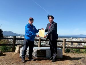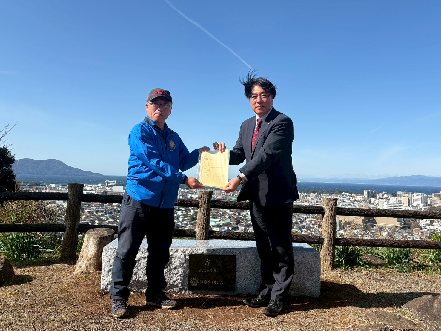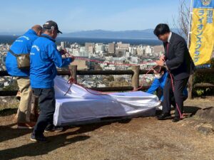 2026年3月7日(土)環境保全委員会担当によるアクティビティ例会が開催され、香貫山香陵台にてベンチの贈呈式を行いました。式典には頼重市長にお越しいただき、橋本会長とともに除幕を行っていただきました。